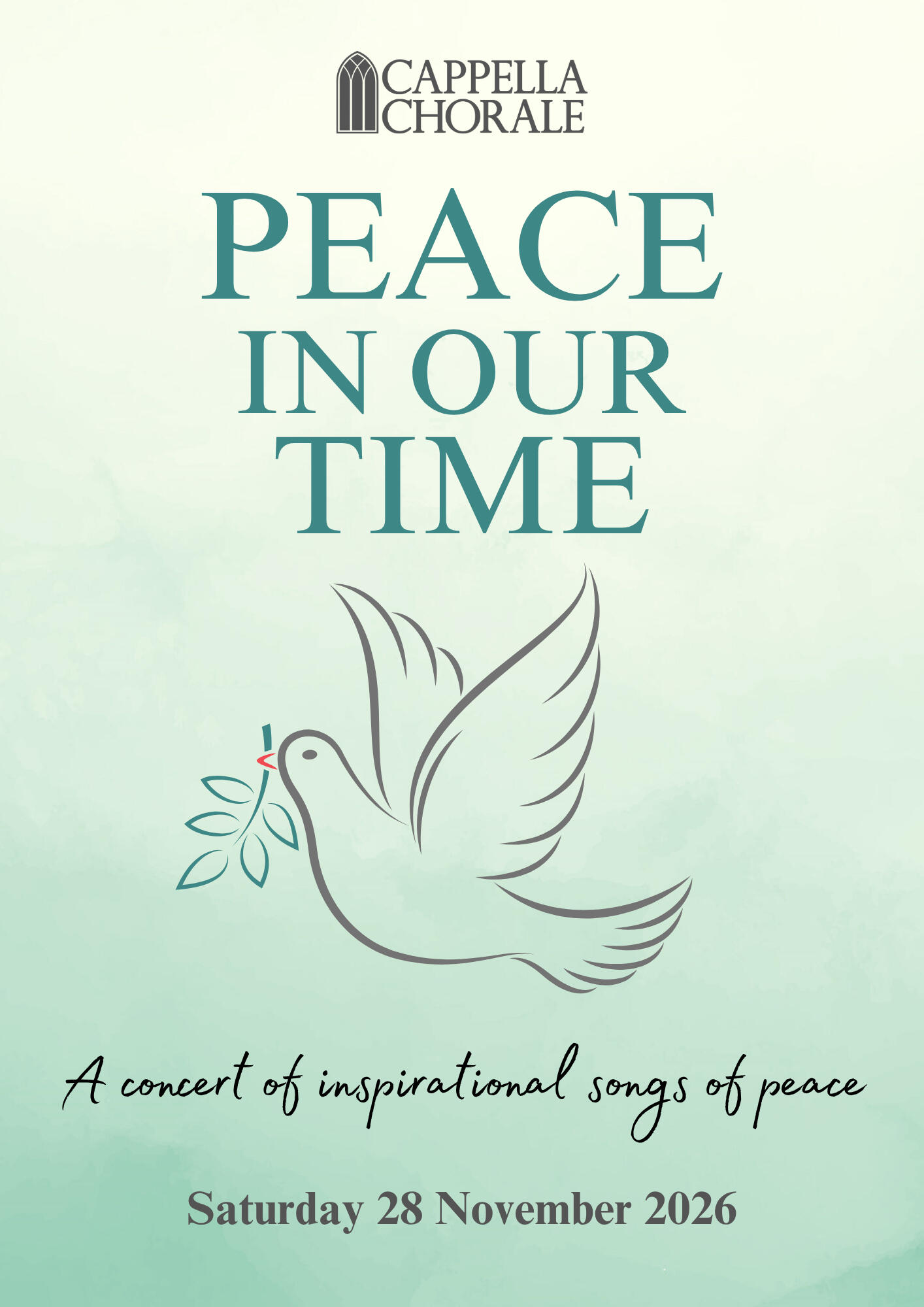 PEACE IN OUR TIMEExperience the transformative power of music as Cappella Chorale presents Peace In Our Time - a moving celebration of hope, unity, and harmony.This unforgettable concert will feature bespoke choral arrangements of inspirational songs of peace drawn from cultures across the globe. Audiences will be taken on a powerful journey through music that uplifts the spirit, bridges divides, and reminds us of our shared humanity.With soaring melodies and rich harmonies, Peace In Our Time is more than a concertโit is a heartfelt invitation to reflect, connect, and find strength in the universal language of song.